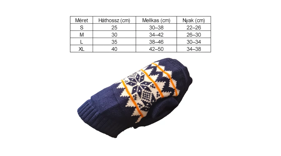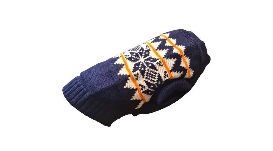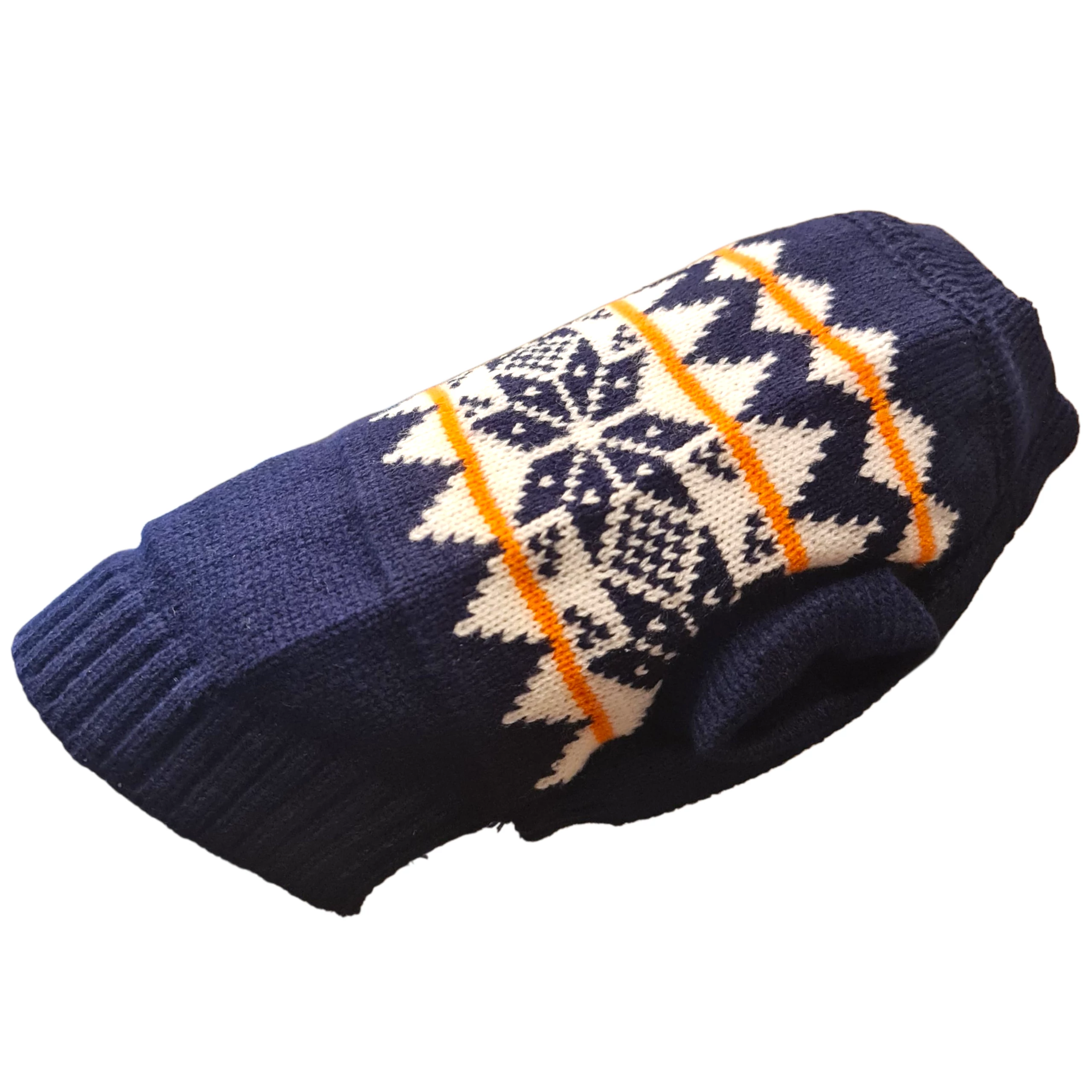Téli kötött kutyapulóver - norvégmintás, hópelyhes motívummal sötétkék L-es méret