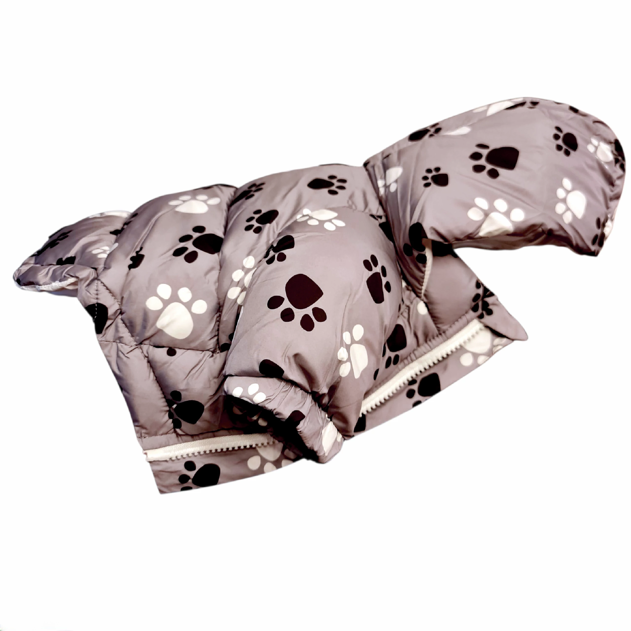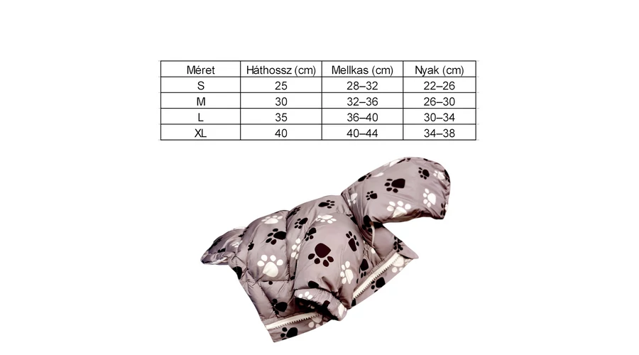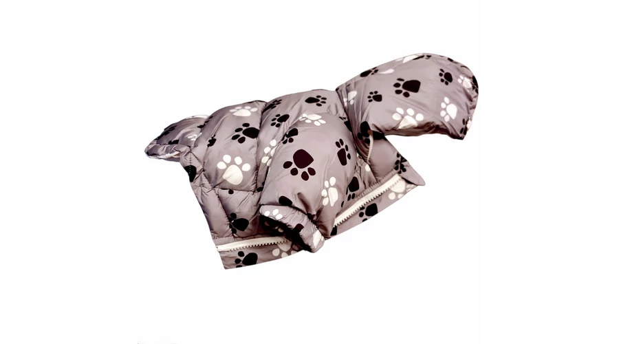 Téli kutyakabát tappancsmintával – szürke színben, kapucnival S-es méret