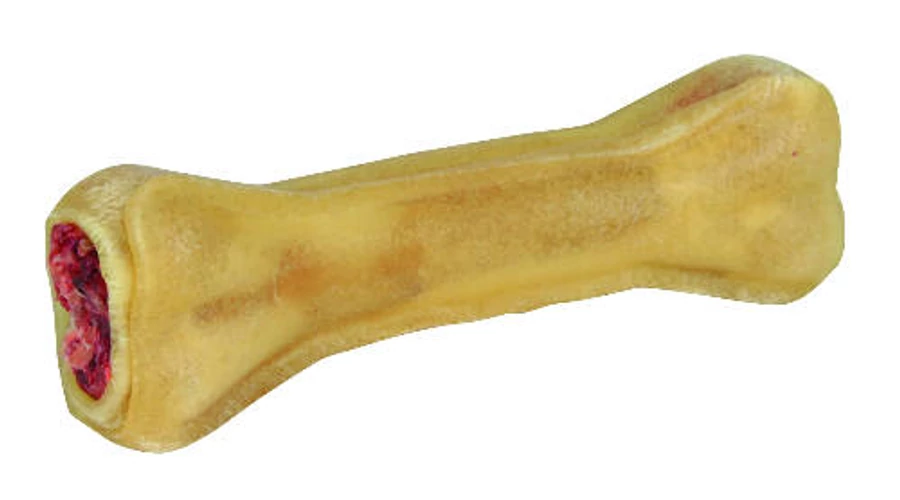 Szárított nyersbőrből készült rágócsont, szalámi ízű pacalos töltelékkel. Ínyenc kutyarágcsa.